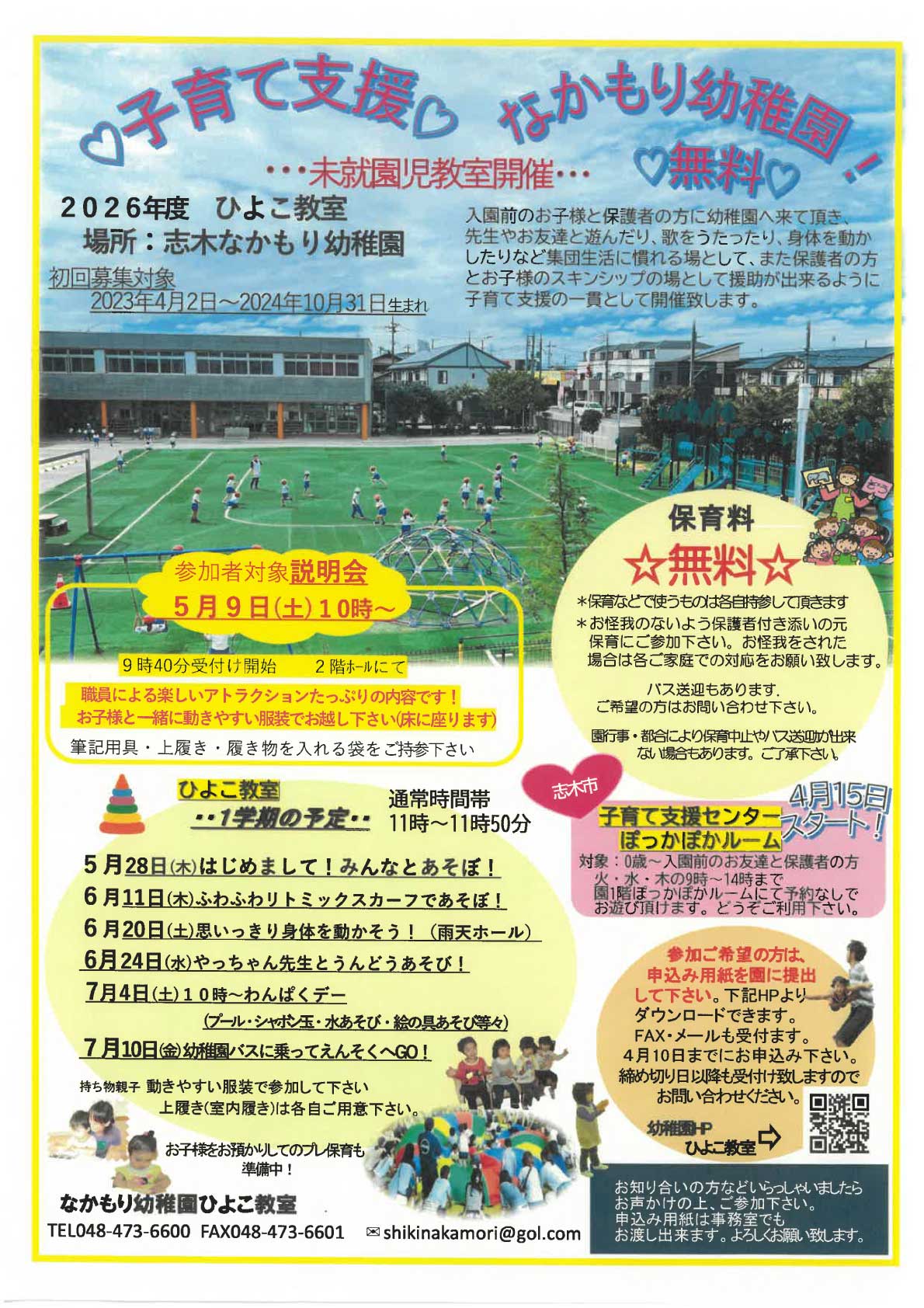 入園前のお子様と保護者の方に幼稚園へ来て頂き、先生やお友達と遊んだり、歌をうたったり、身体を動かしたりなど集団生活に慣れる場として、また保護者の方とお子様のスキンシップの場として援助が出来るように子育て支援の一貫として開催致します。
